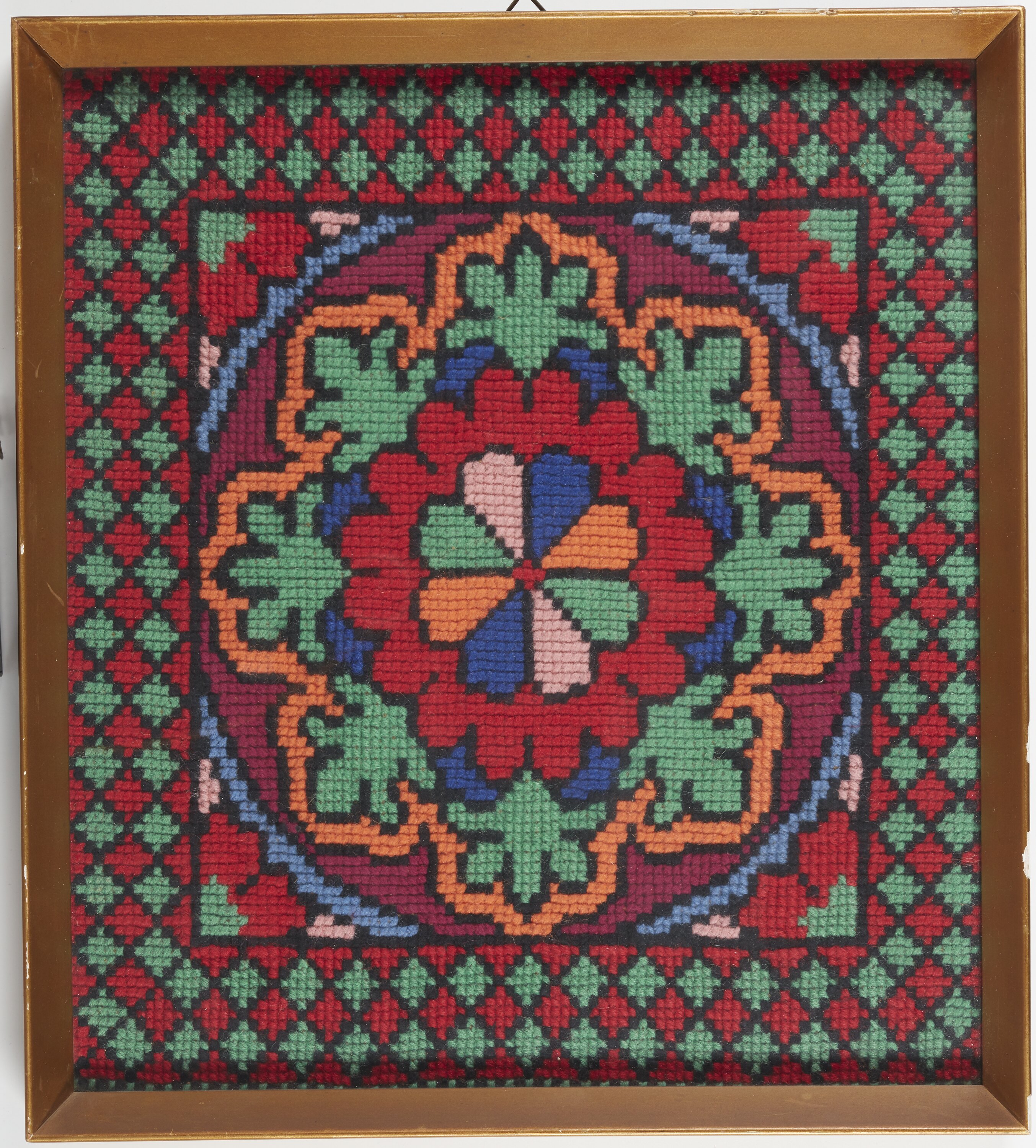 A nearly square piece of a hessian bag embroidered with a central 8-petalled floral motif in blue, green, yellow and light pink coloured thread, surrounded by a red scalloped margin and 8 green leaf motifs outlined in yellow. This whole floral motif is set on a dark red background within a ring of cobalt blue, which in turn is bounded by a rectangular margin patterned with red and green diamond shapes. The tapestry is mounted in a simple, gold-coloured bevel frame.