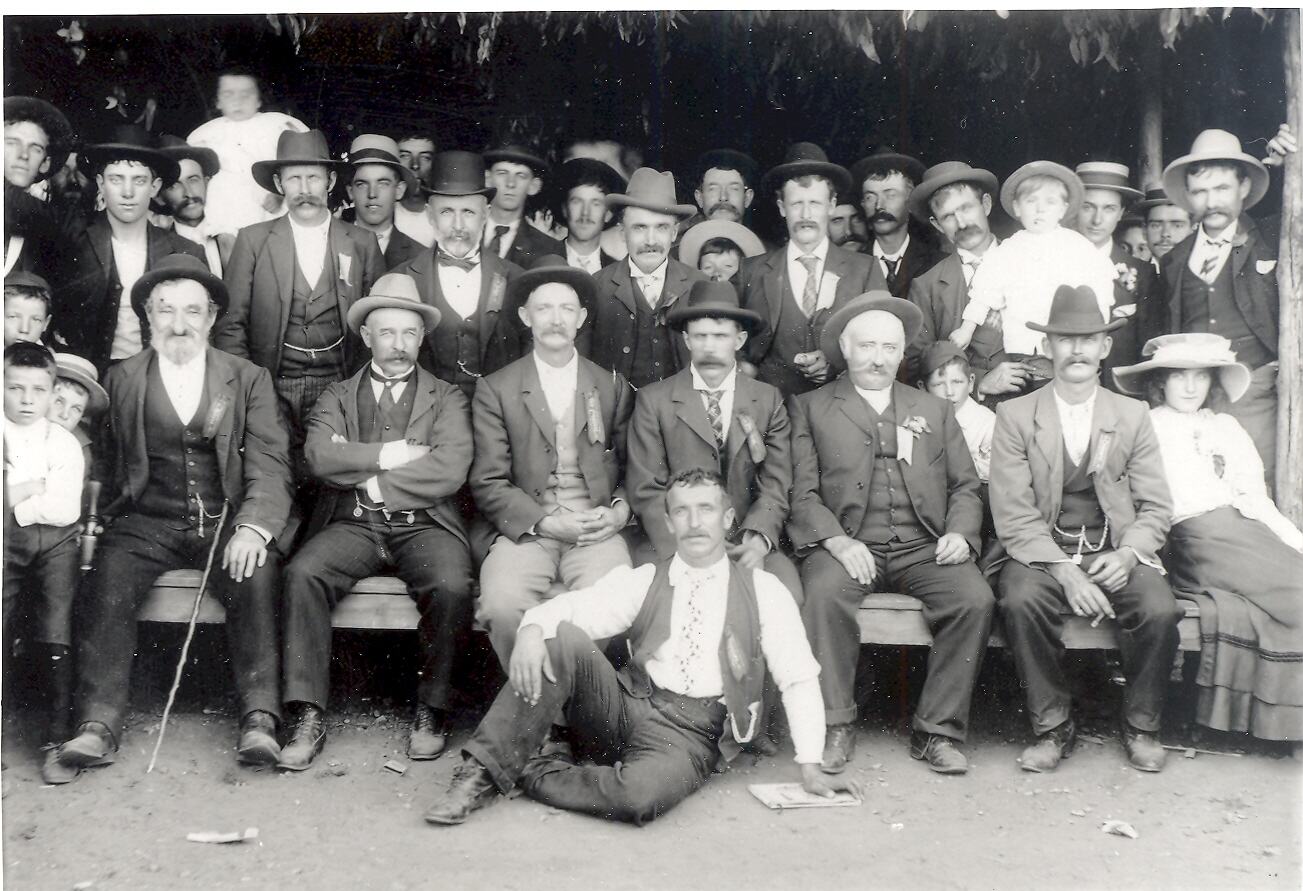 A group of men with one girl and several young children. One man is seated on the ground in front of a row of men and children sitting down. The remaining men are standing behind them.