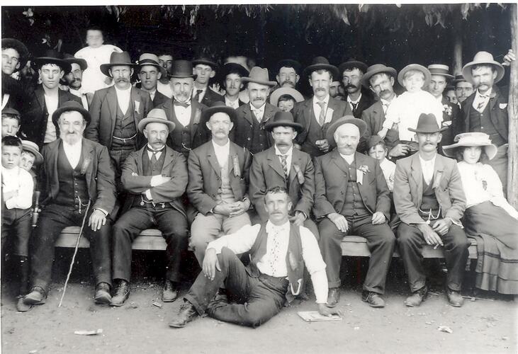 Handwritten note on sticker on the back of the photograph: "Copied from original held by / Victorian State Building Trades' / Union, Bricklayers' Division; / Bricklayers sports committee / delegates / c. 1920s".