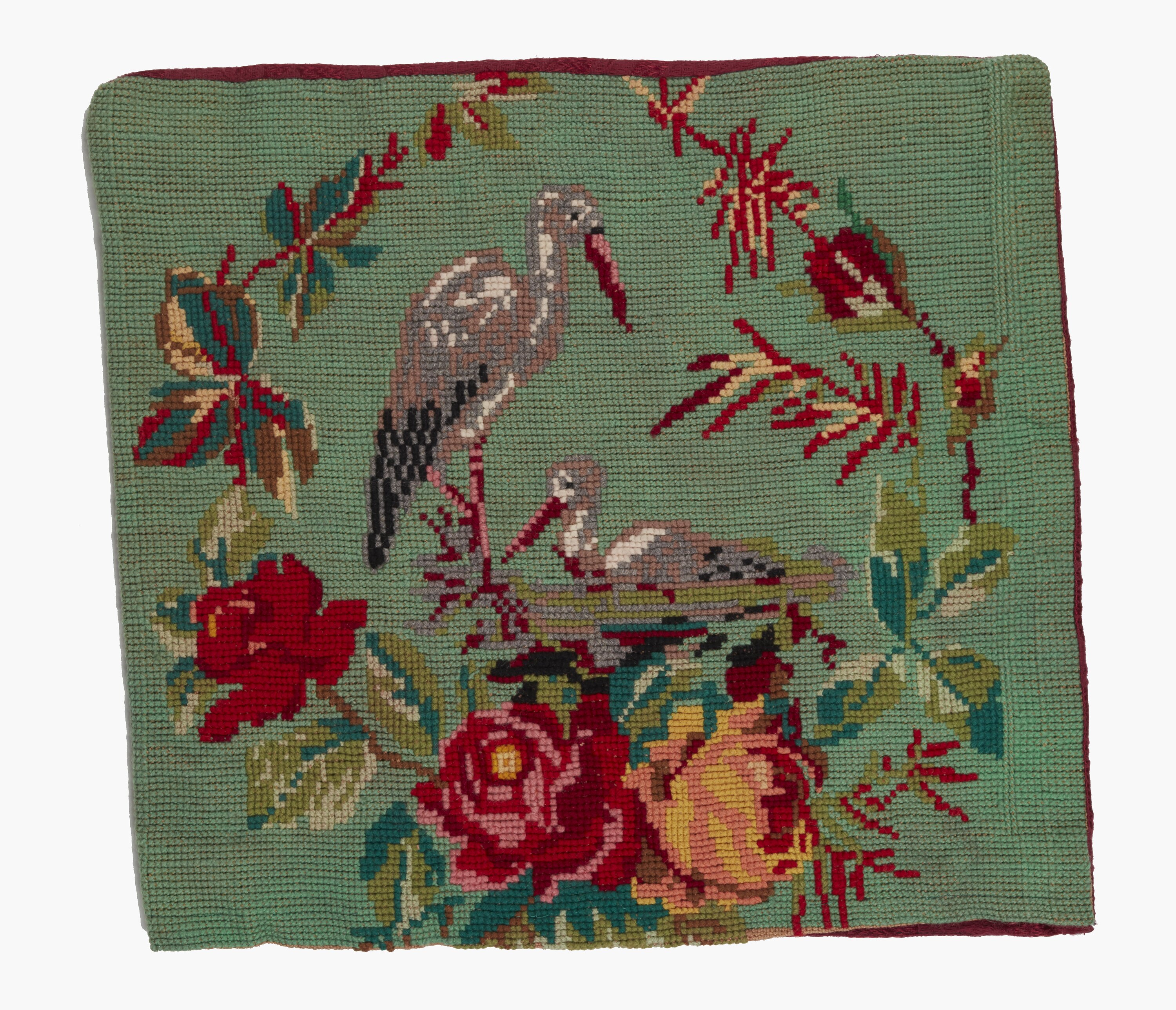 Cushion cover stitched with storks and flowers design, made by Katerina Senjov, Geelong, late 1950s (one of a pair). Katerina was interested in mythology and Natalie Senjov-Makohon remembers her telling stories about storks.