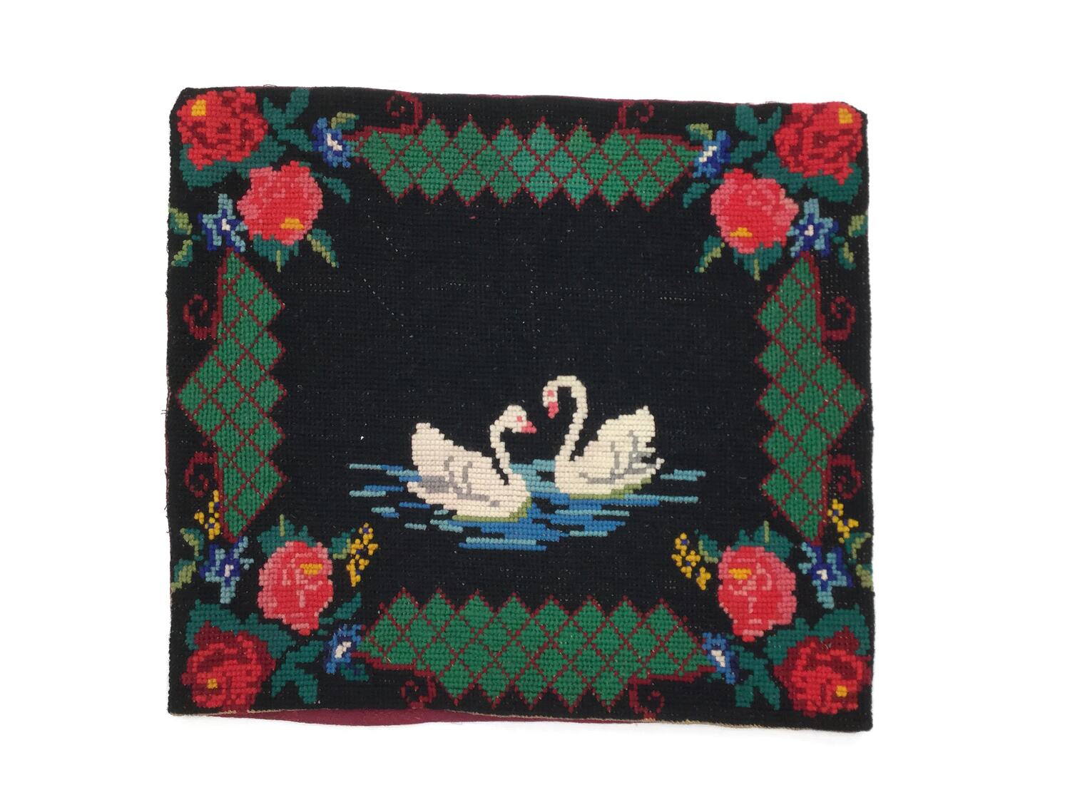 A material cushion cover embroidered on one side with images of two white swans on blue water within a border comprising two red roses and other floral motifs in each corner connected by a margin of diamond shapes in grey-green thread outlined in red, all on a black background.