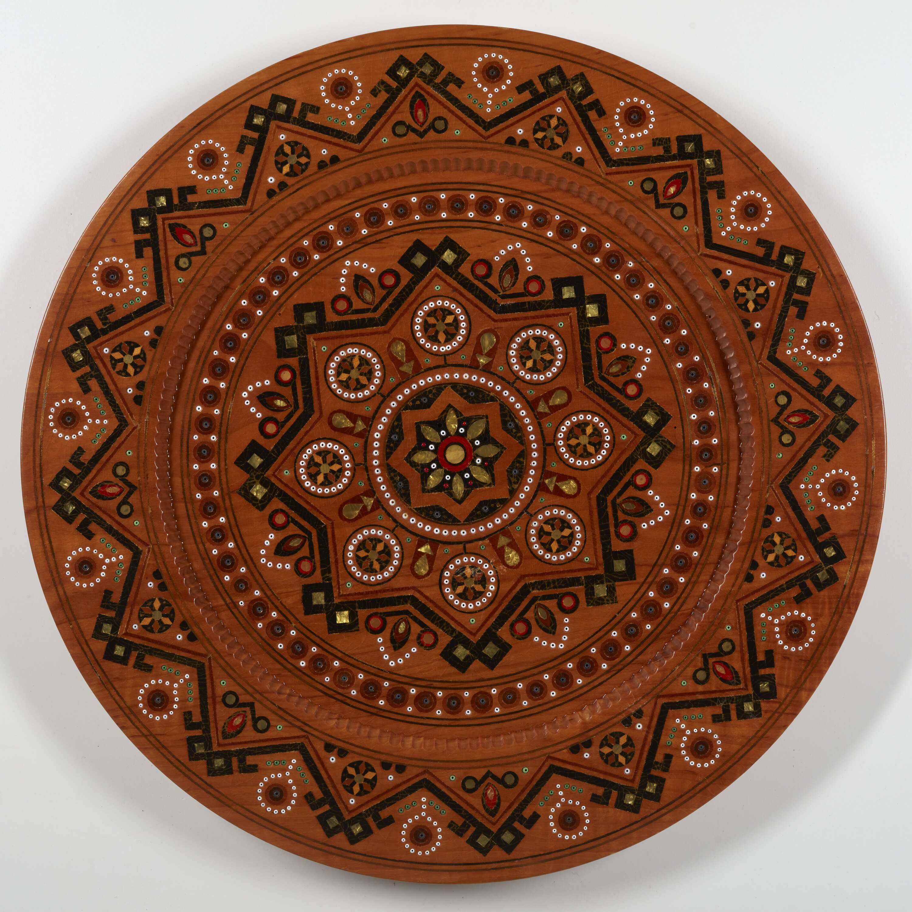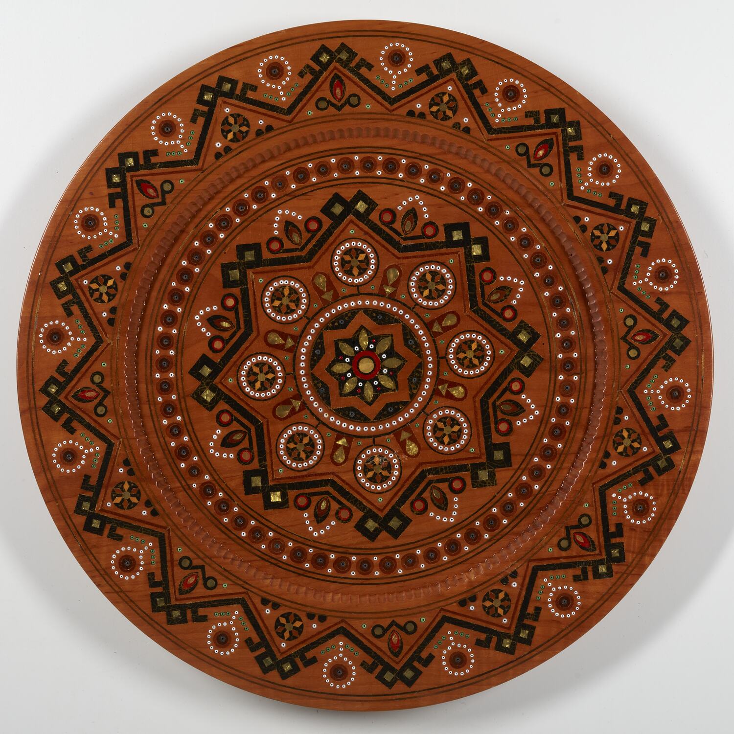 Varnished brown timber plate with intricate inlay work and central floral motif.