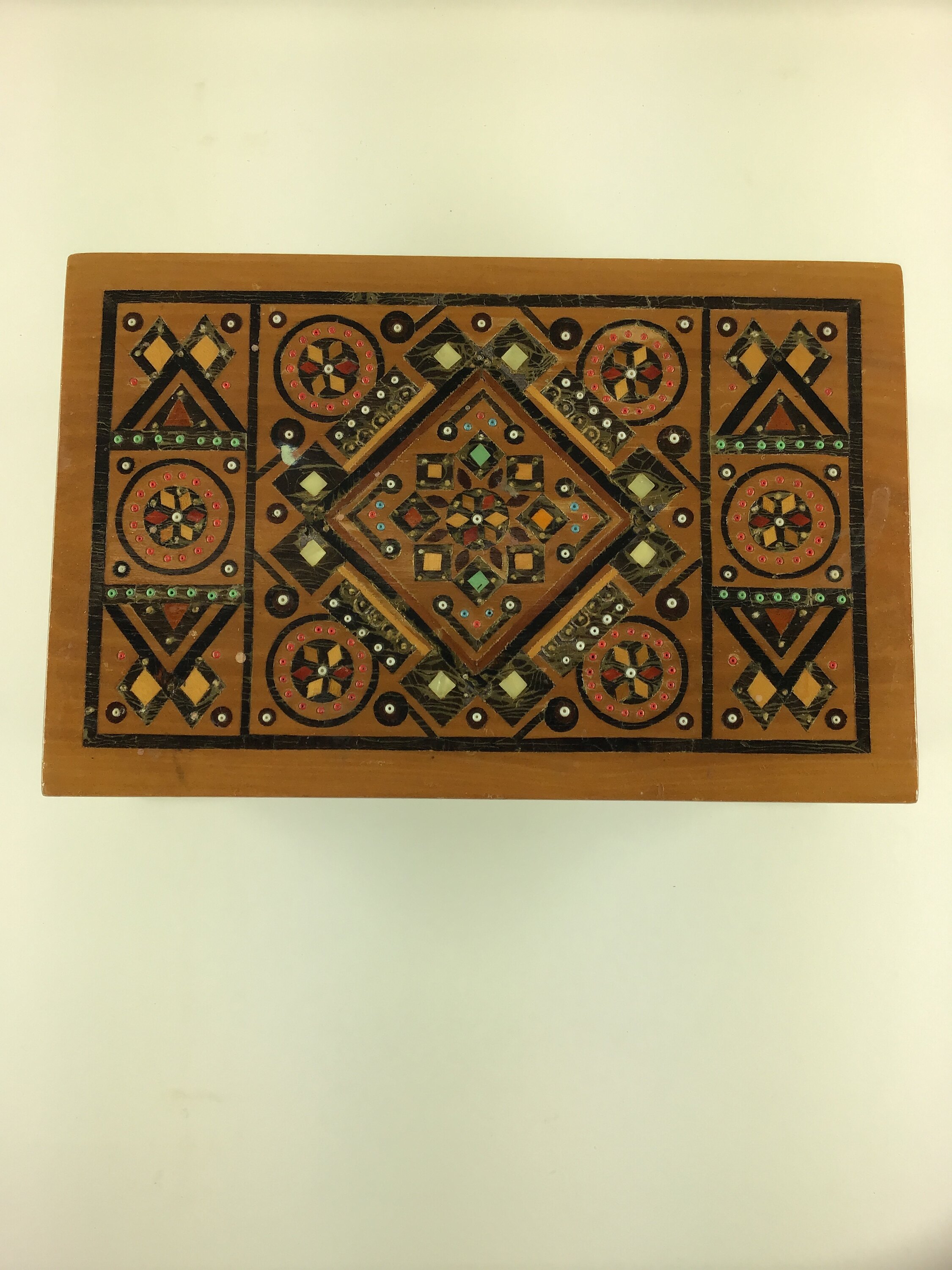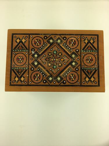 Timber inlay work jewellery box. Made by Konstantin Lubarski, an eastern Ukrainian post World War II migrant who settled in Melbourne (Moonee Ponds). He was a member of the Orthodox community and was a timber inlay specialist. Lubarski gave the jewellery box (and plate HT 62903) to Natalie Senjov-Makohon in the 1980s, believing she would appreciate and care for them.