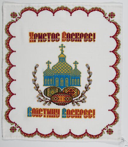 A square of cotten or linen of off-white or natural colour embroidered with red, blue, yellow and green thread with an image of a three-domed church building in the centre above three Easter eggs. Above and below the church image are words in Ukrainian Cyrillic script and around the edge of the cloth is a scalloped border in dark red, green and yellow coloured thread.