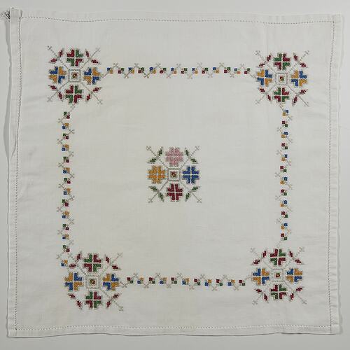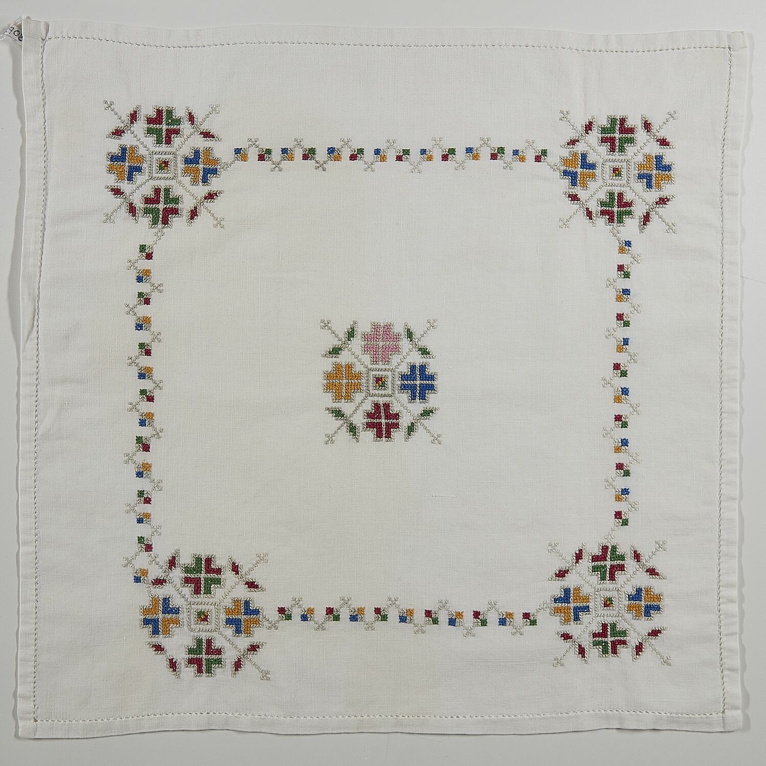 A square of cotton or linen of off-white or natural colour with an embroidered pattern comprising five geometric compound motifs each with four cruciform shapes and diagonal lines, arrayed with one in each of the corners of a square and the fifth one centrally in the square. The corner motifs are connected with a line of diamonds and zigzag linework.