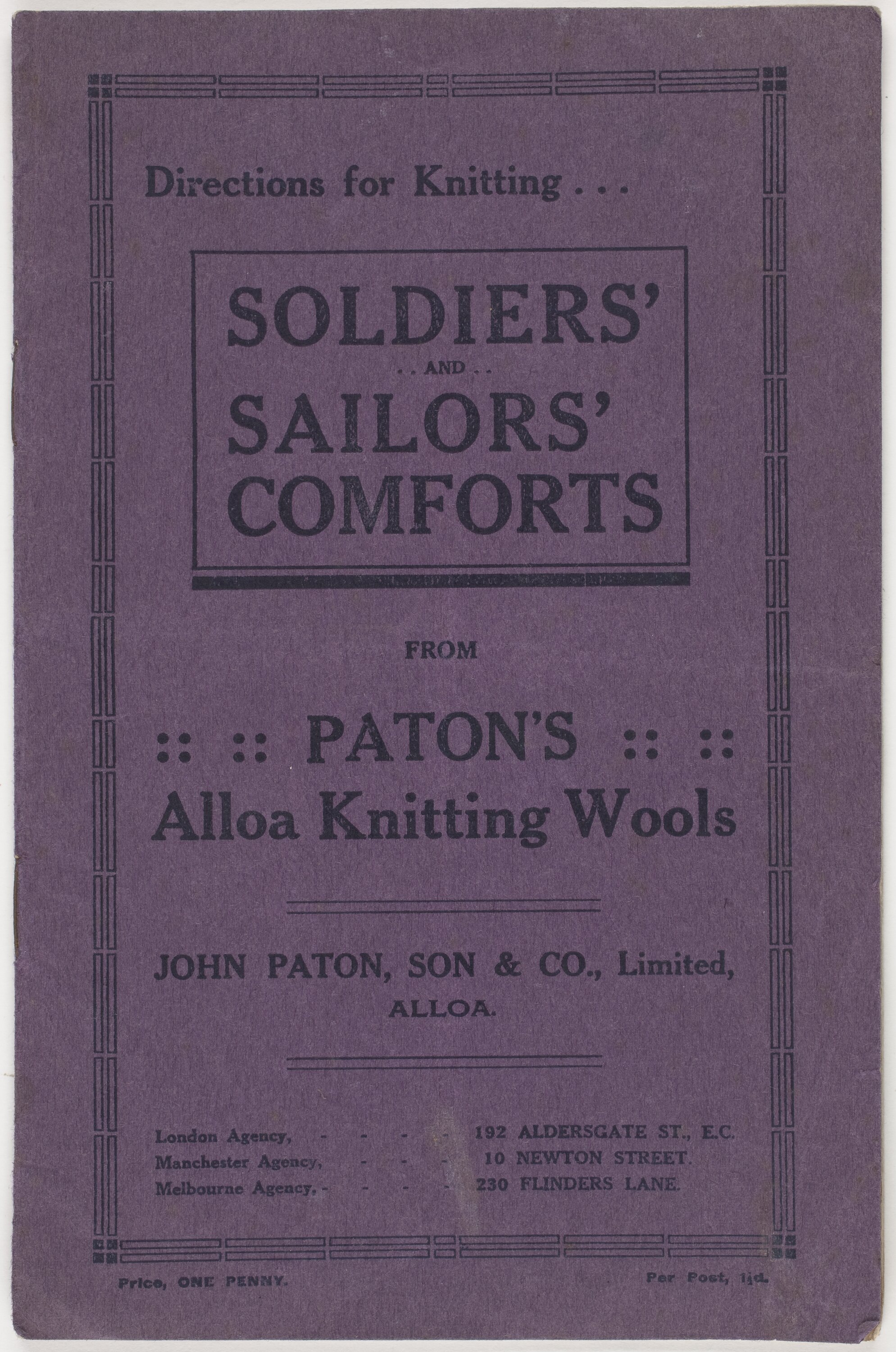 Booklet containing knitting patterns for soldiers, and sailors. The garments are illustrated. Made by John Paton, Son & Co Ltd. Publications Maclare, Macdonald & Co., Glasgow, circa 1914. Likely to have been used during World War I for making soldiers' comforts.