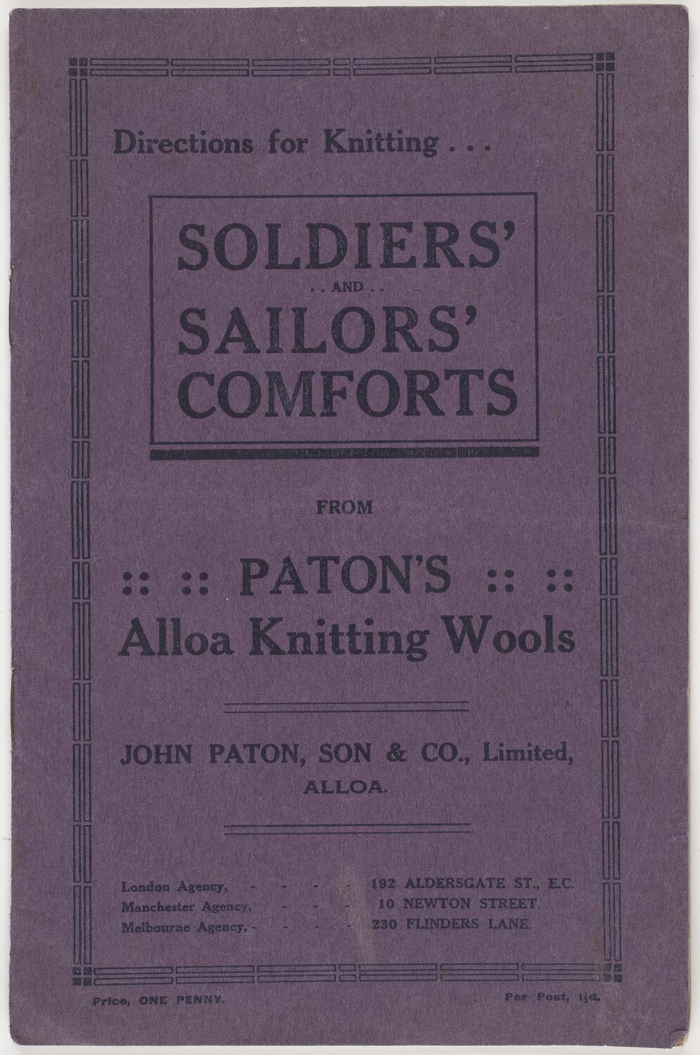 Printed front cover: Directions for Knitting Soldiers' & Sailors' comforts from Patons Alloa Knitting Wools.