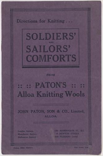Booklet containing knitting patterns for soldiers, and sailors. Garments illustrated. Inside front cover is contents page for garments: mittens, cardigan s, chest and neck protector, cholera belts, gloves, helmets, etc. Inside back cover are advertisements for wool. Stapled at spine.