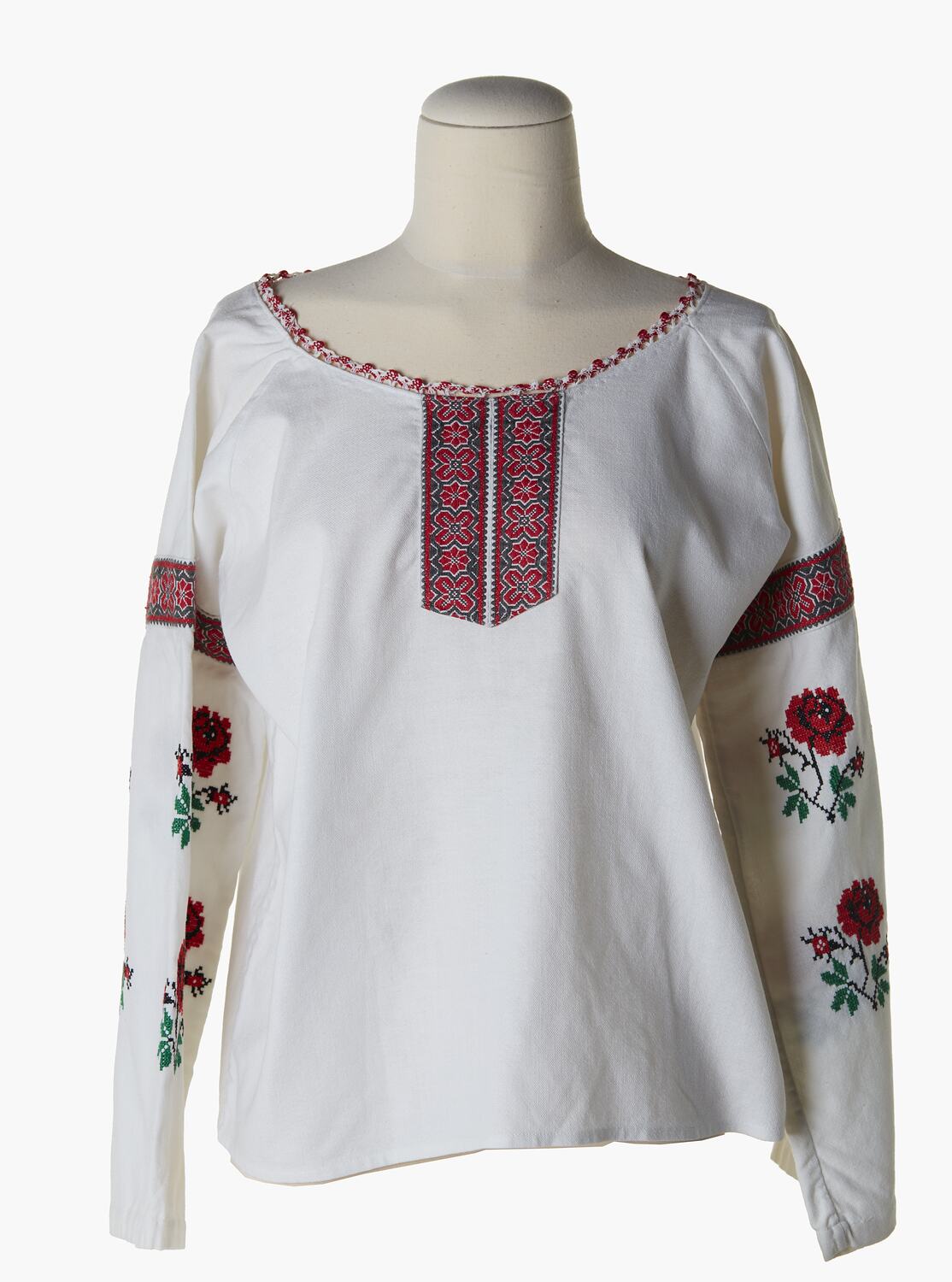 Thick white cotton blouse with red, green and black cross-stitch flowers on wide sleeves, red and grey applied trim down front and at shoulders and red stitch trim around neckline.