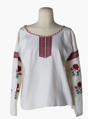 Blouse hand-made and embroidered by Natalie Senjov-Makohon to dance at concerts whilst she was part of a Ukrainian Dancing Group, Melbourne, late 1960s-early 1970s. She did not embroider all the strips. Natalie purchased some detailing from Jobs Warehouse in Bourke Street Melbourne as she did not have time to complete it (her mother Katerina was horrified!)