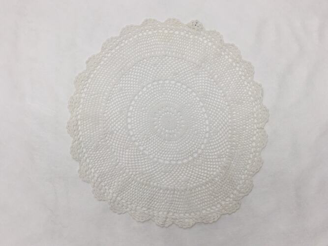 White crochet doily made by Natalie Senjov-Makohon in Melbourne, late 1960s.
