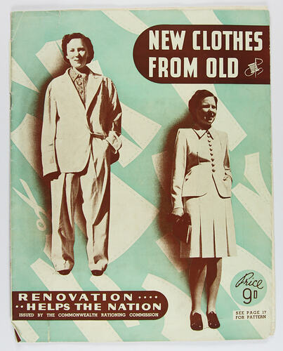 Booklet of advice and patterns for making 'New Clothes from Old', published by the Commonwealth Rationing Commission in 1942, during World War II. It describes ways of using old clothes to make new ones and emphasises value of this work.