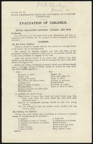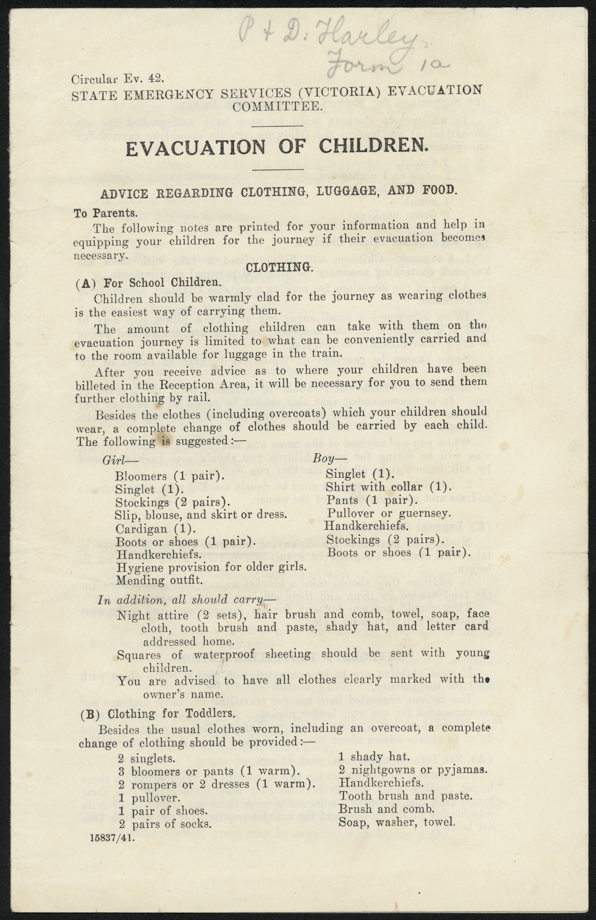 Seven-page booklet entitled 'Evacuation of Children: Advice Regarding Clothing, Luggage, and Food'. Published in 1942 by the State Emergency Services (Victoria) Evacuation Committee.