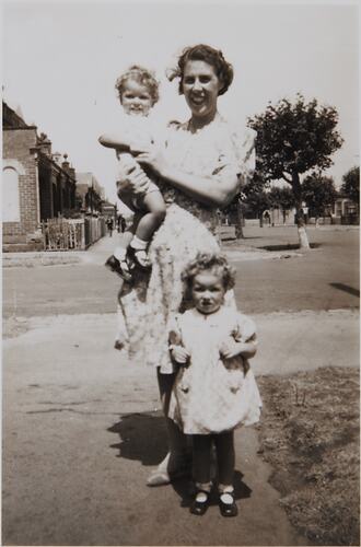Photograph of Mrs Vi Morgan with her two children, circa 1943. Kay was born in April 1941 and James was born in September 1942. Vi is standing outside her home, 105 Page Street, Albert Park, with the house on the opposite corner, number 107, visible.