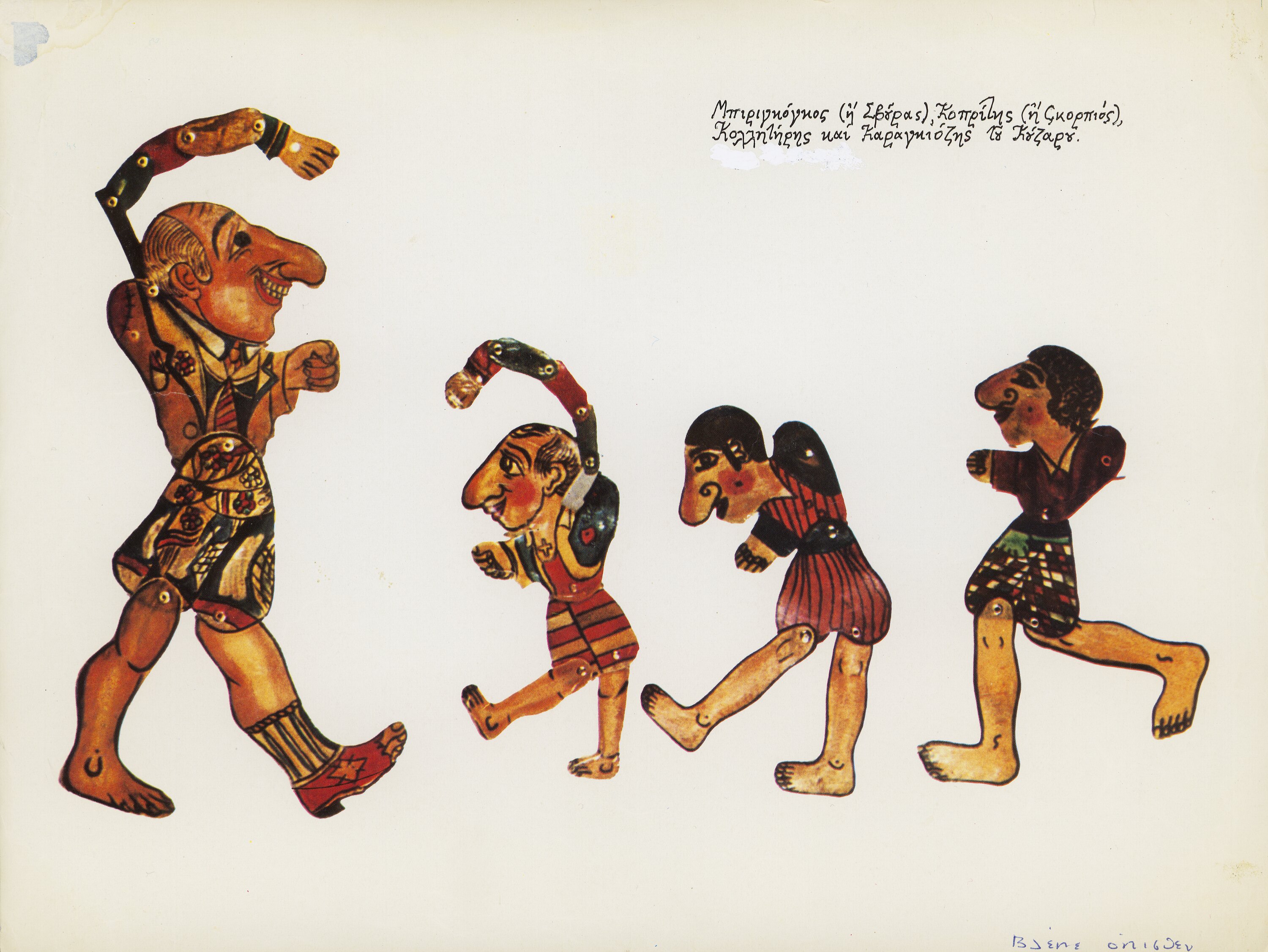 Small poster in landscape format, featuring four animated Greek Shadow Puppet Theatre characters in brown colour tones: Birigokos, Kopritis, Kolitiris and Karaghiozis. Top right hand corner has text in Greek [see inscrioptions for translation].