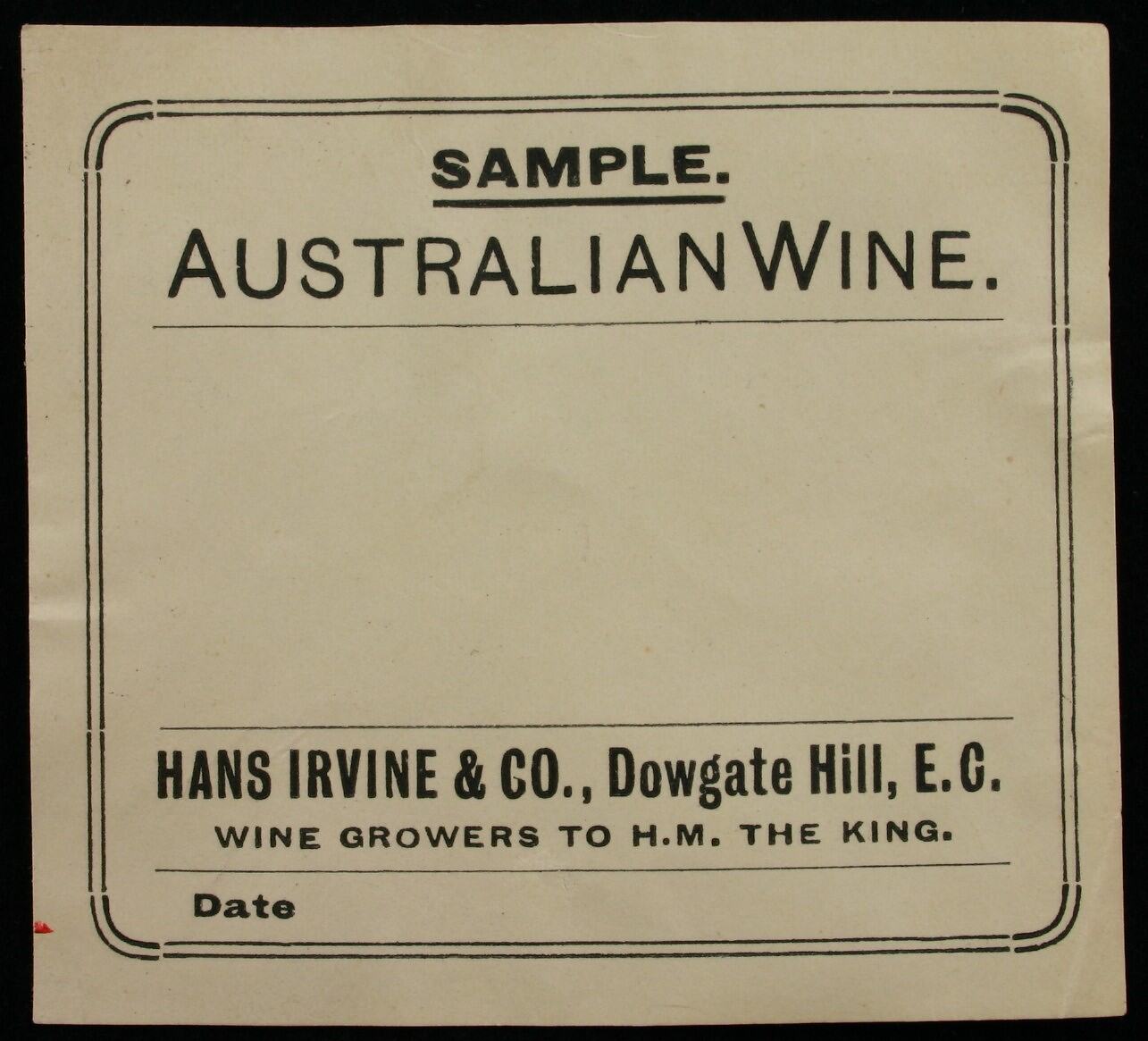 Text: SAMPLE/AUSTRALIAN WINE./HANS IRVINE & Co., DOWGATE HILL, E.C./WINE GROWERS TO H.M. THE KING /Date.