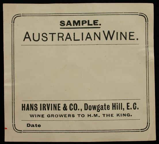 Wine label is printed in black ink and reads: "Sample Australian wine. Hans Irvine & Co. Dowgate Hill. London, E.C. Wine growers to H.M. the King."