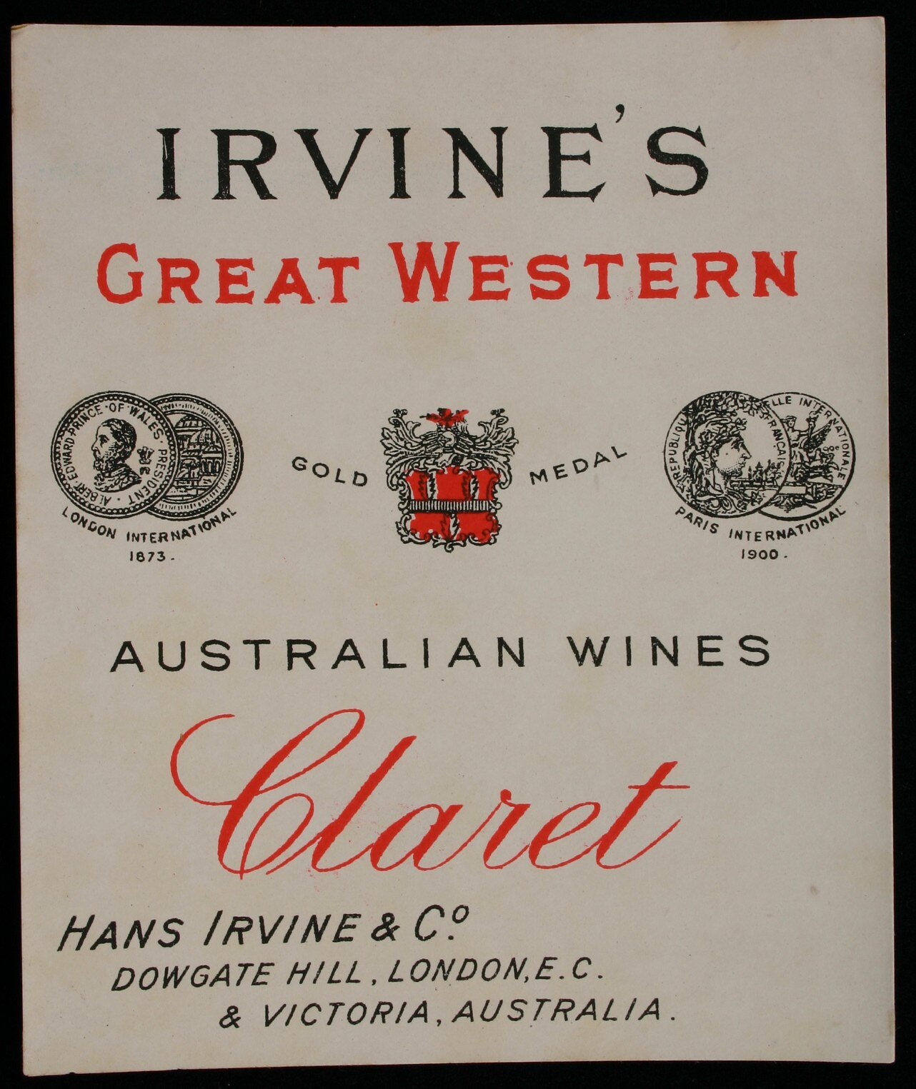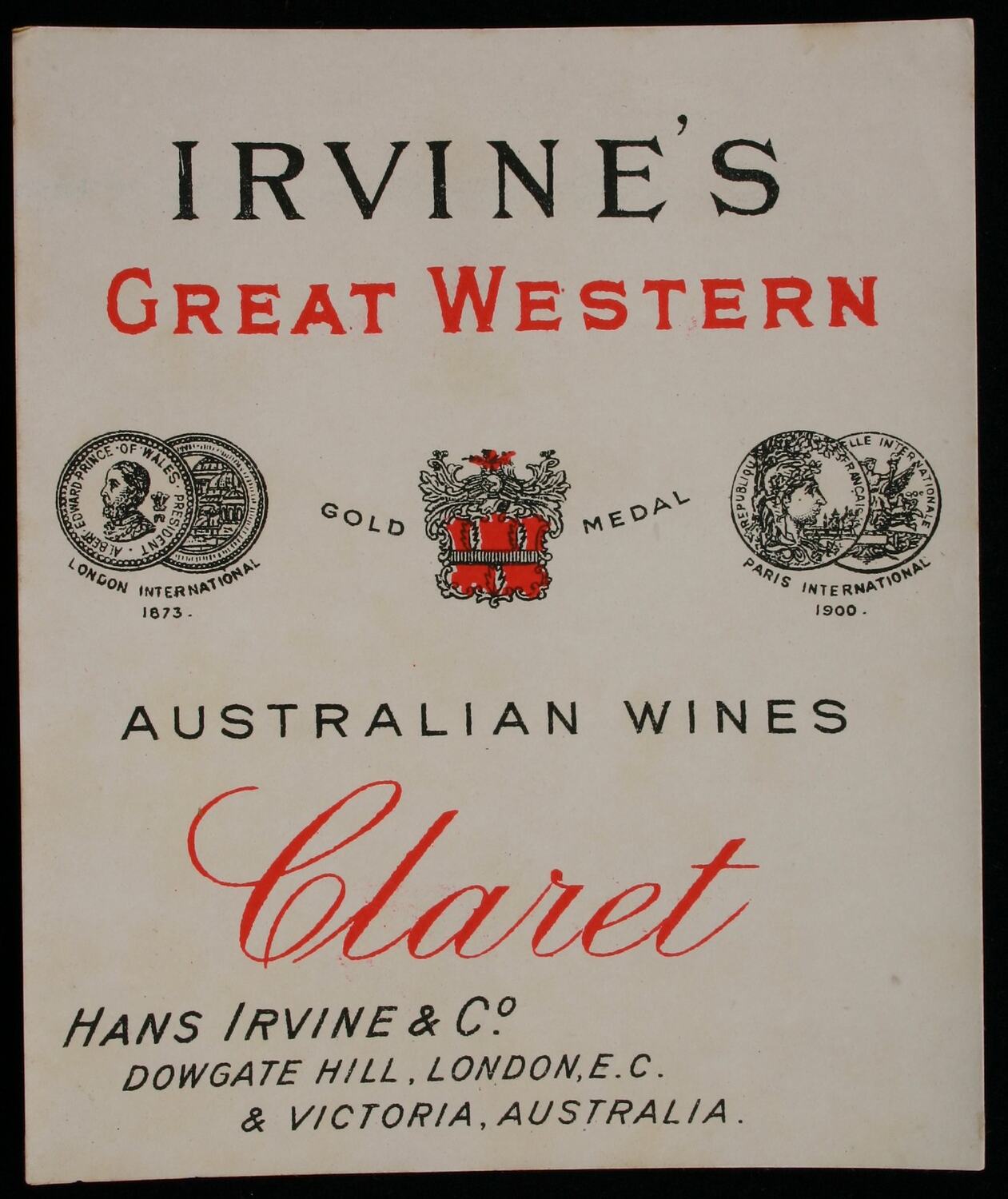 Text: IRVINE'S/GREAT WESTERN/LONDON INTERNATIONAL/1873/GOLD MEDAL/PARIS INTERNATIONAL/1900/AUSTRALIAN WINES/Claret/HANS IRVINE & Co./DOWGATE HILL, LONDON, E.C./& VICTORIA, AUSTRALIA.