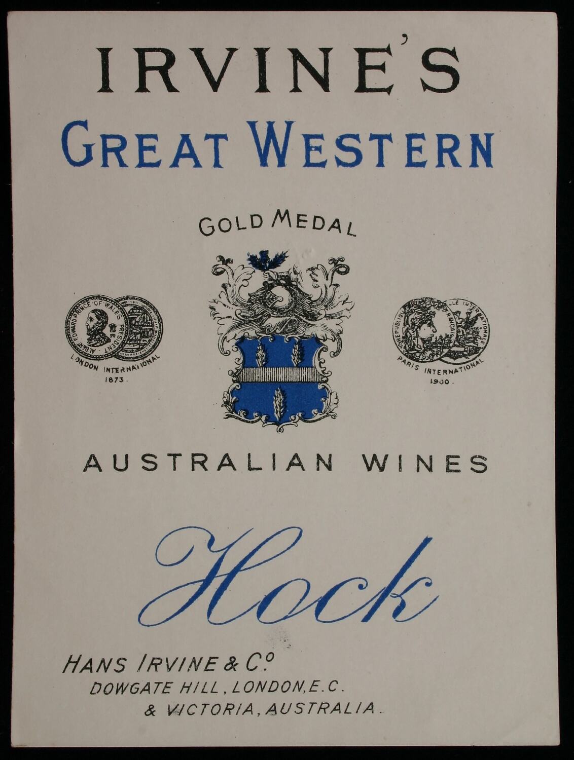 Wine label is printed in black and blue ink and reads: ""Irvine's Great Western gold medal London International 1873 Paris International 1900 Australian wines Hock. Hans Irvine & Co. Dowgate Hill. London, E.C. and Victoria, Australia".