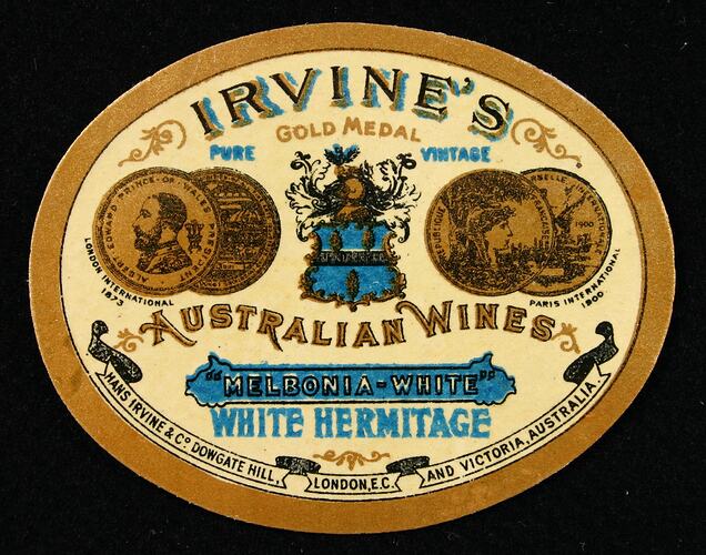 Text: IRVINE'S/GOLD MEDAL/PURE VINTAGE/LONDON INTERNATIONAL/1873/PARIS INTERNATIONAL/1900/AUSTRALIAN WINES/MELBONIA-WHITE/WHITE HERMITAGE/HANS IRVINE & Co. DOWGATE HILL/LONDON E.C. AND VICTORIA AUSTRALIA.