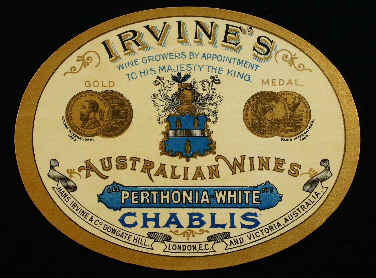 Text: IRVINE'S/WINE GROWERS BY APPOINTMENT/TO HIS MAJESTY THE KING/GOLD MEDAL/LONDON INTERNATIONAL/1873/PARIS INTERNATIONAL/1900/AUSTRALIAN WINES/PERTHONIA-WHITE/CHABLIS/HANS IRVINE & Co. DOWGATE HILL. LONDON, E.C. AND VICTORIA, AUSTRALIA.