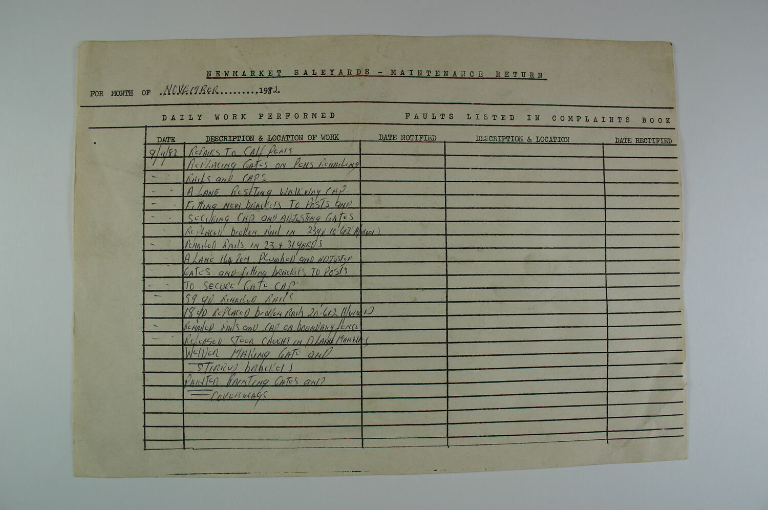 Single A4 page typed sheet lists number and place for maintenance and by whom. Extra areas for maintenance are written in by hand. Located in the sub-station office of Newmarket Saleyards. Columns for date, description and location of work. First entry, in black biro, is dated 9 November 1982, for repairs to calf pens. Under 'FAULTS LISTED IN COMPLAINTS BOOK' are columns for date notified, description and location and date rectified. These columns unused.