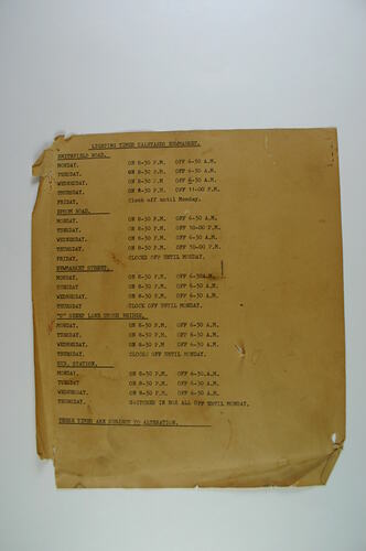 Notice typed on paper about lighting times at Newmarket Saleyards, located on the wall of the sub-station office. Lists days and time lights went on and off for: Smithfield Road, Epsom Road, Newmarket Street, "C" sheep lane under bridge, Sub-Station.
