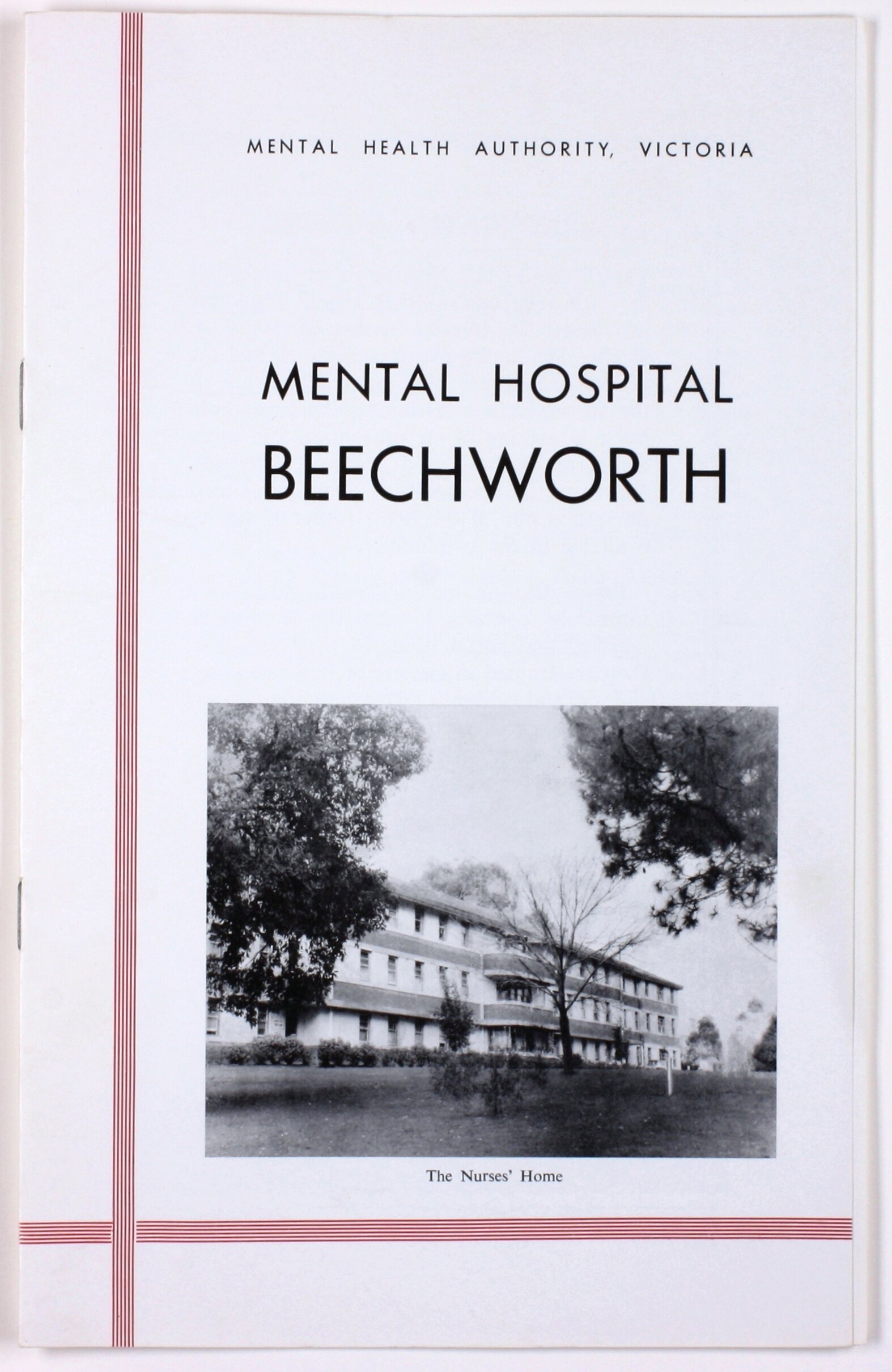Front cover of booklet is white with black text and a red-lined border. Bottom half of cover has a black and white photograph showing the nurses' home at Beechworth Mental Hospital.