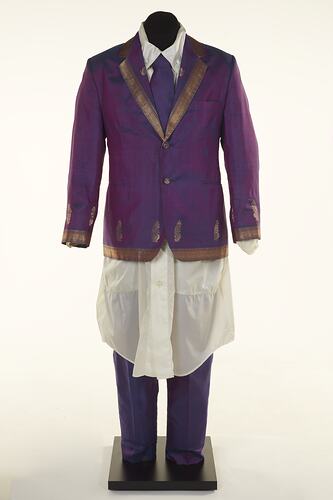 The collection of six ensembles from the wardrobe of Melbourne fashion identity Shiva Singam represent his love of fashion, and how he melded together both western and Indian dress to create his look and express his identity. In an interview in The Age newspaper in 1996, looking at the best dressed of Melbourne in the lead up to the Spring Racing Carnival, the then 22yo said "Exotic, eclectic and a lot of fun is my style. I mix a lot of European designers with traditional garments and that really exemplifies my look. Then I clean it up with Indian jewellery or accessories." He proudly wore outfits such as those on offer to events such as the cup, charity events, Melbourne Fashion Week and the Melbourne Fashion Festival, the Indian Film Festival and the recently launched Indian Fashion Week, which he helped launch in 2022.