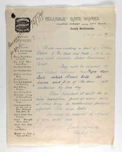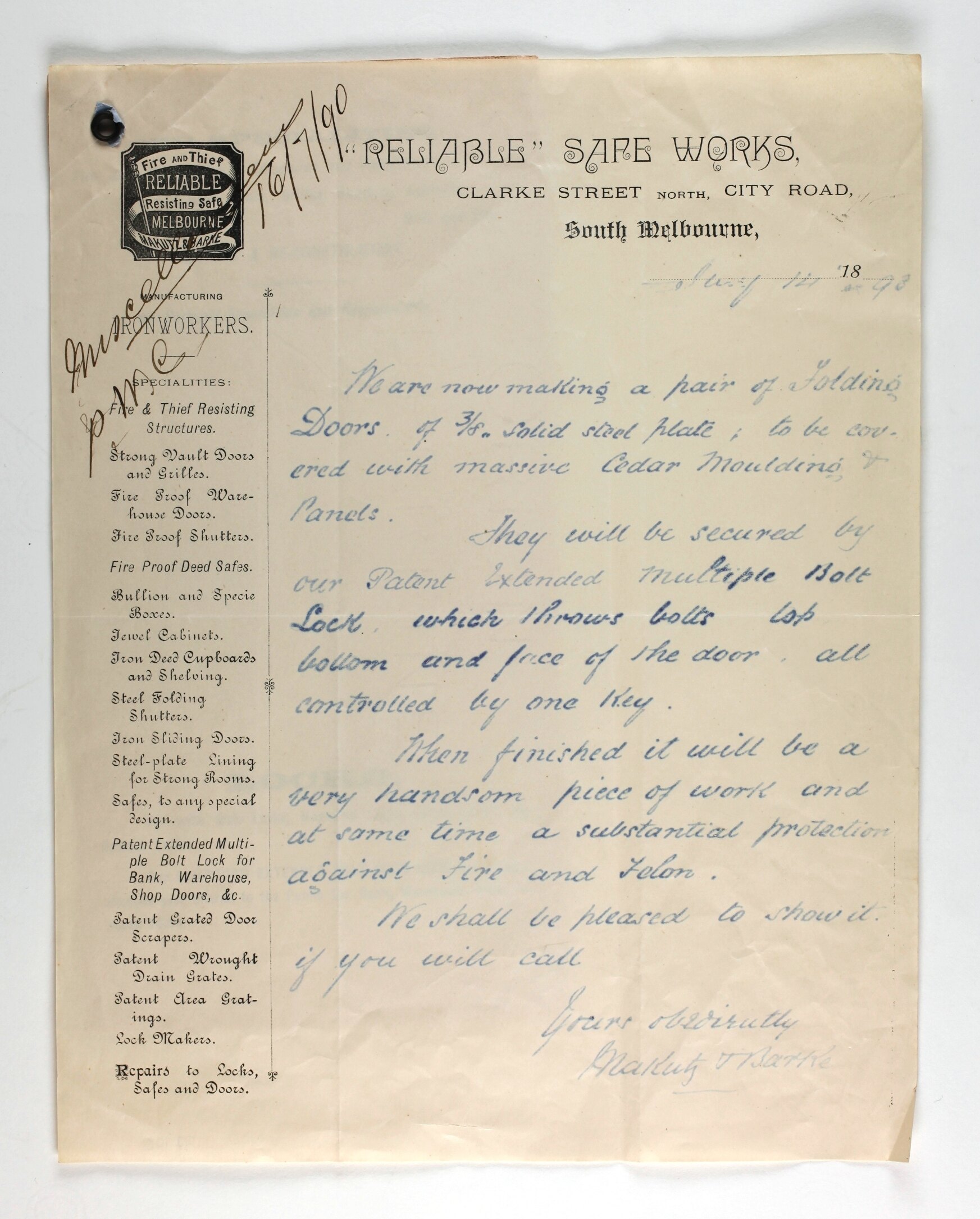 Carbon copy letter, dated 1 May 1893. The letter outlines the construction of a security door, steel plated with a special locking system, to be installed in the (Royal) Exhibition Building. Attached is a pamphlet outlining the activities of the firm, Makutz and Barke, Reliable Safe Works. Also noted in the pamphlet was the company's award of a First Order of Merit and Silver medal at the 1888 Melbourne Centennial International Exhibition.