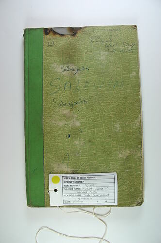 Foolscap size and format book with green crocodile printed stiff front and back covers, green cloth binding. Stiff grey paper end papers. Approximately 100 pages, some have been removed. Information entered in both red and blue ball point ink. Upper edge of cover and end paper have been singed. The word "Saleyards" has been written several times, also on end paper. Some apparent insect damage to front and back covers.