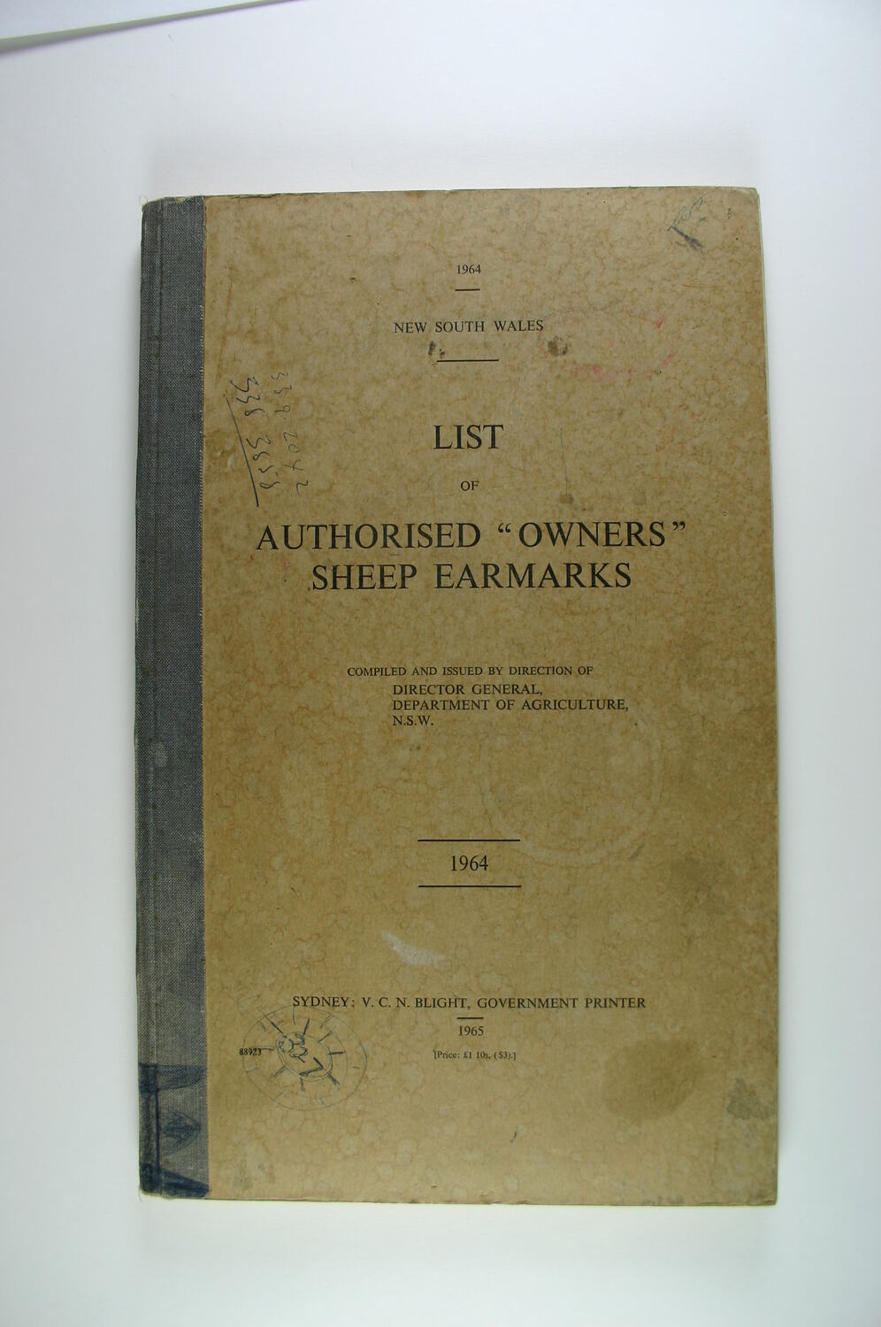 Book cover reads "1964/NEW SOUTH WALES/LIST OF/AUTHORISED 'OWNERS'/SHEEP EAR MARKS/Compiled and issued by direction of/Director General/Department of Agriculture/N.S.W.....1964/ Sydney: V.C.N. Blight, Government Printer/1965/[Price one pound ten shillings ($3)]."