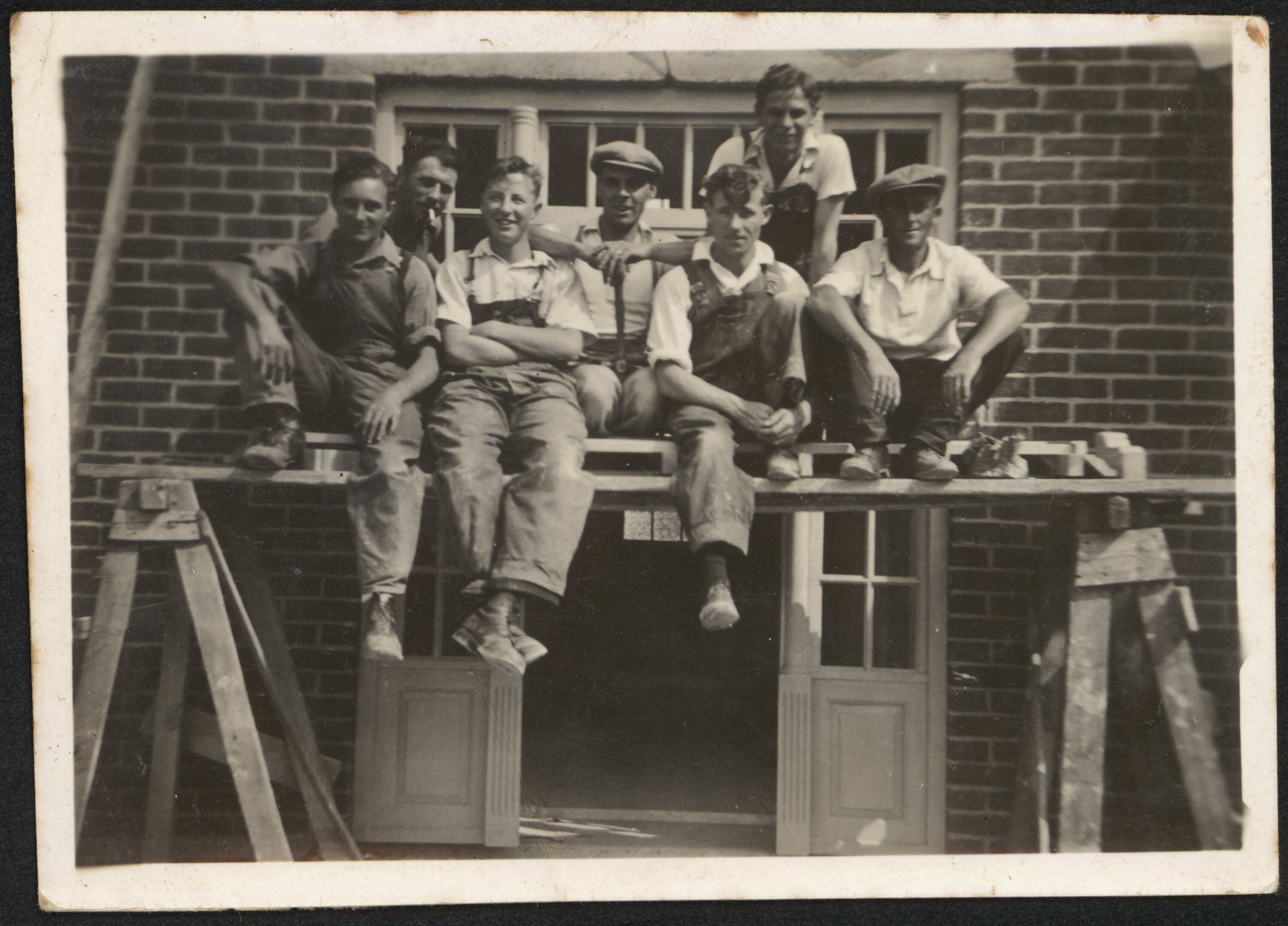 Digitised copy of a black and white photographic print of Hubert Halls sitting on a trestle with six workmates on a building site at Fort Warden, Isle of Wight, England, circa 1952. They are working on converting the fort into a holiday camp. Hubert, a carpenter by trade, is first from left. Fort Warden had been armed with guns and during World War II acted as a command post and searchlight battery.