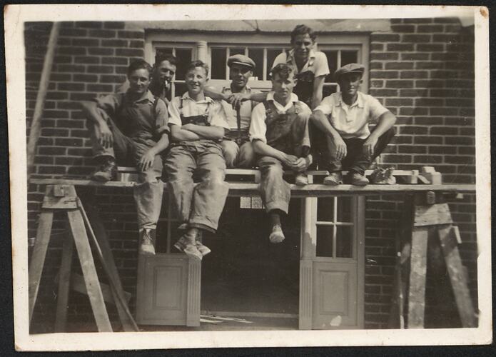 Seven men seated on a timber plang suspended on two trestles with a brick building and doorway in background.