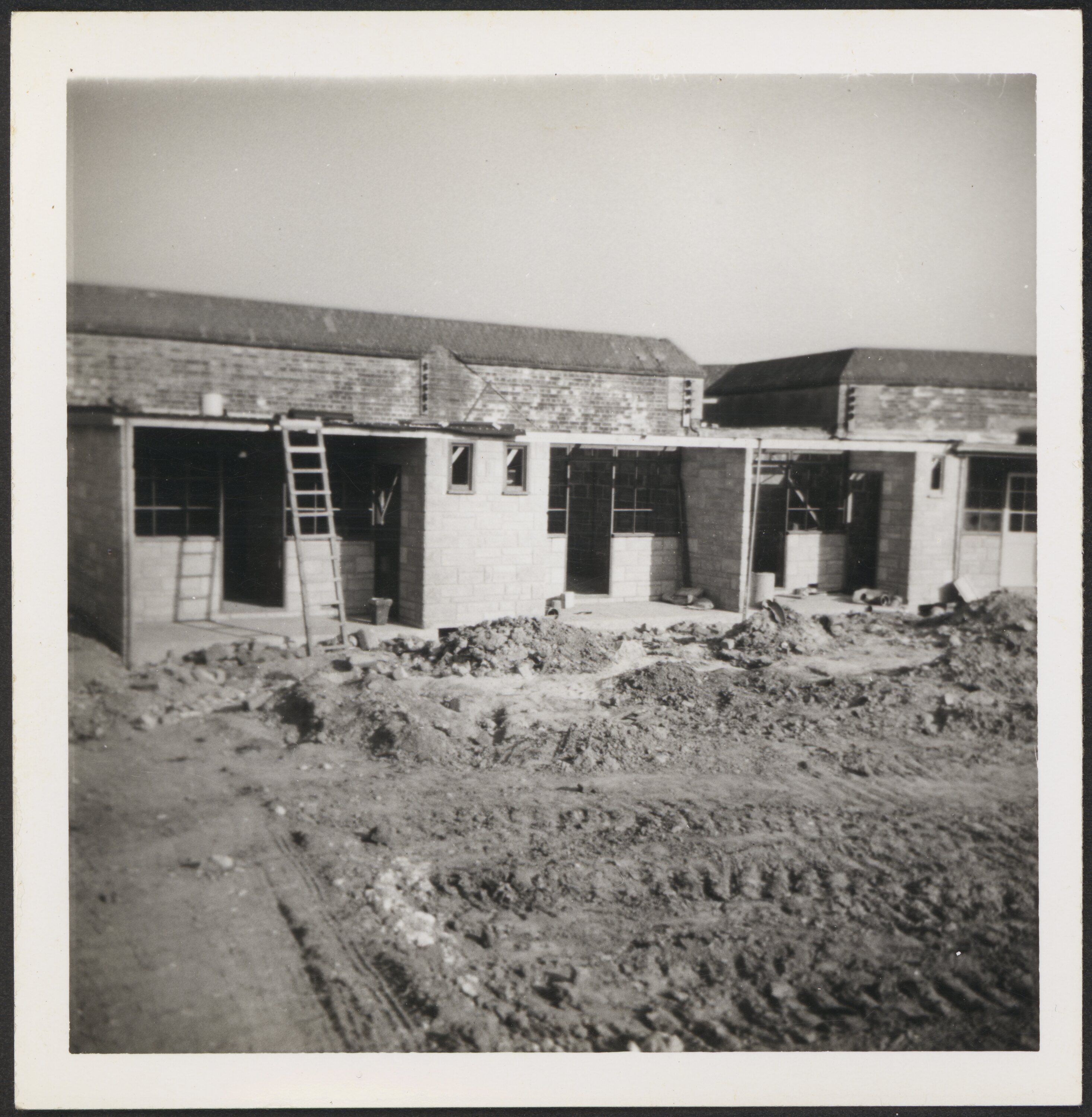 Digitised copy of a black and white photographic print of units in the process of being built as part of the conversion of Fort Warden in a holiday camp, Isle of Wight, England, circa 1952. Fort Warden had been armed with guns and during World War II acted as a command post and searchlight battery before being converted into holiday camp units during the 1950s. Hubert Halls was a carpenter working on this project during the 1950s before migrating with his family to Australia in 1963.