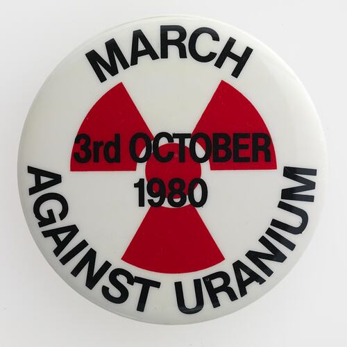 Anti-nuclear campaigns were being set up world-wide from the late 1950s onwards, with the movement really peaking in the 1970s. Amongst these general campaigns, there were some that specifically targeted uranium mining. Such organisations flourished in Australia, as it was and is still one of the world's largest exporters of uranium. Movement Against Uranium Mining (MAUM), for example, was involved in campaigns against nuclear weapons and French nuclear testing in the Pacific, as well as commemorations of Hiroshima Day. However, as the name suggests, their main aim was to lobby against uranium mining. Because of the popularity of the Vietnam Moratorium marches, a National Uranium Moratorium campaign was started in 1976 and by 1977 the Melbourne rally had 15.000 participants. This badge seems to belong to a similar public manifestation one year later.