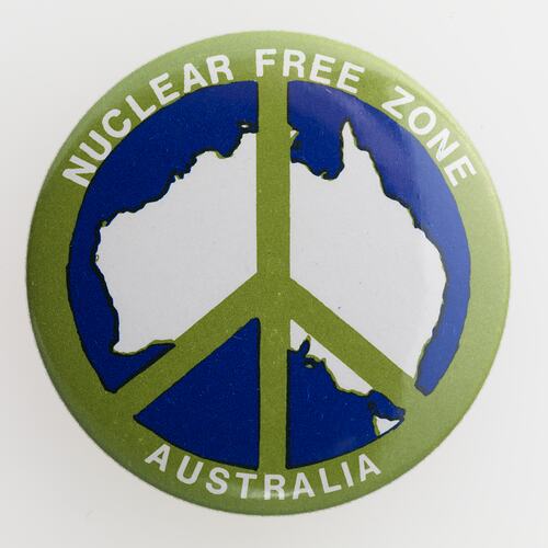 Round badge with the slogan 'Nuclear Free Zone Australia', circa 1960s-1980s. This is one of a series of badges and peace movement posters acquired by the museum following the exhibition 'Peace: an Exhibition' which explored the Peace movement and was part of the Victorian Government contribution to International Year of Peace in 1986. The badges explore the peace movement, nuclear disarmament and Hiroshima.