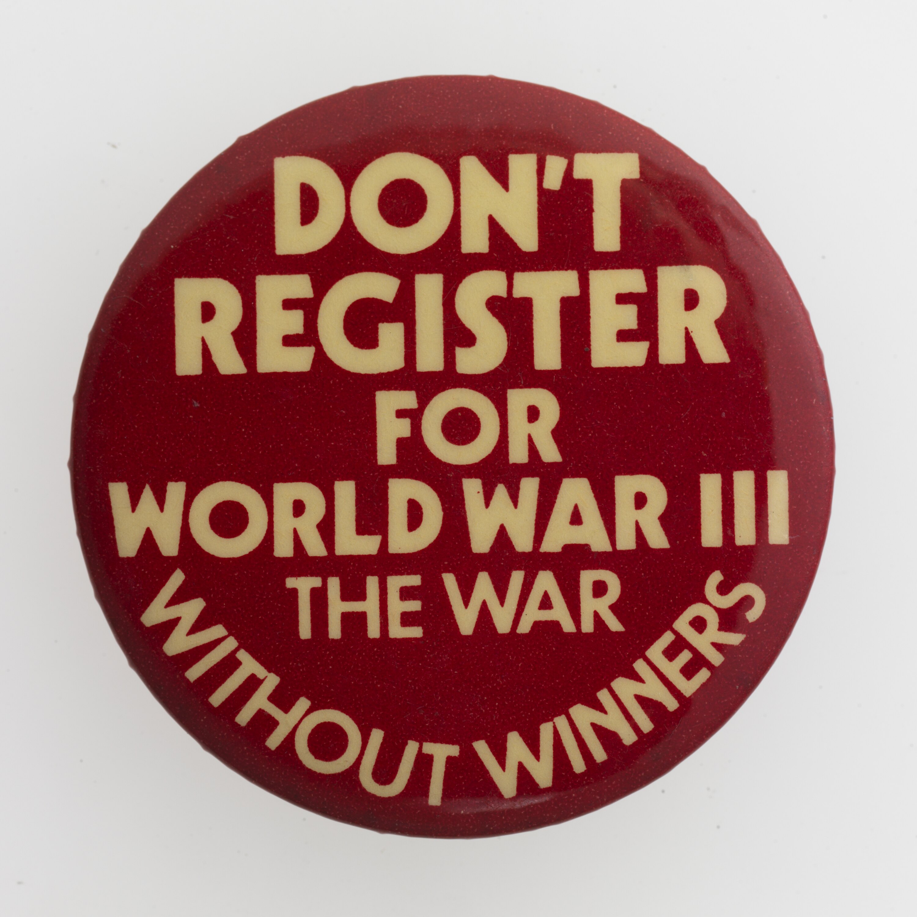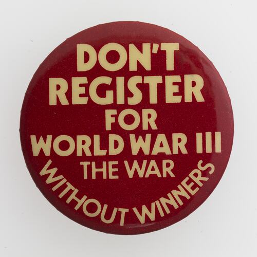 Small round badge with the slogan 'Don't Register for World War III, The War Without Winners', circa 1960s-1980s. This is one of a series of badges and peace movement posters acquired by the museum following the exhibition 'Peace: an Exhibition' which explored the Peace movement and was part of the Victorian Government contribution to International Year of Peace in 1986. The badges explore the peace movement, nuclear disarmament and Hiroshima.