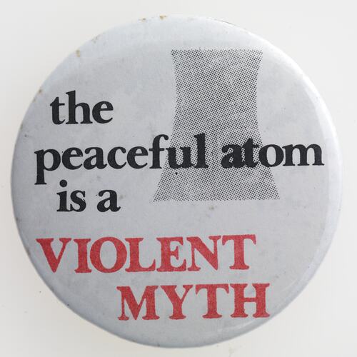 Round badge with the slogan 'The Peaceful Atom is a Violent Myth', circa 1960s-1980s. This is one of a series of badges, t-shirts and peace movement posters acquired by the museum following the exhibition 'Peace: an Exhibition' which explored the Peace movement and was part of the Victorian Government contribution to International Year of Peace in 1986. It was made using Badge-a-Minit, a semi-automatic button-making machine. This meant that people and organisations could manufacture their own badges, bearing messages of their choice.