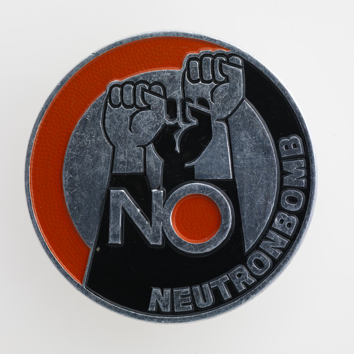 Round badge with the slogan 'No Neutron Bomb', circa 1960s-1980s. This is one of a series of badges and peace movement posters acquired by the museum following the exhibition 'Peace: an Exhibition' which explored the Peace movement and was part of the Victorian Government contribution to International Year of Peace in 1986. The badges explore the peace movement, nuclear disarmament and Hiroshima.