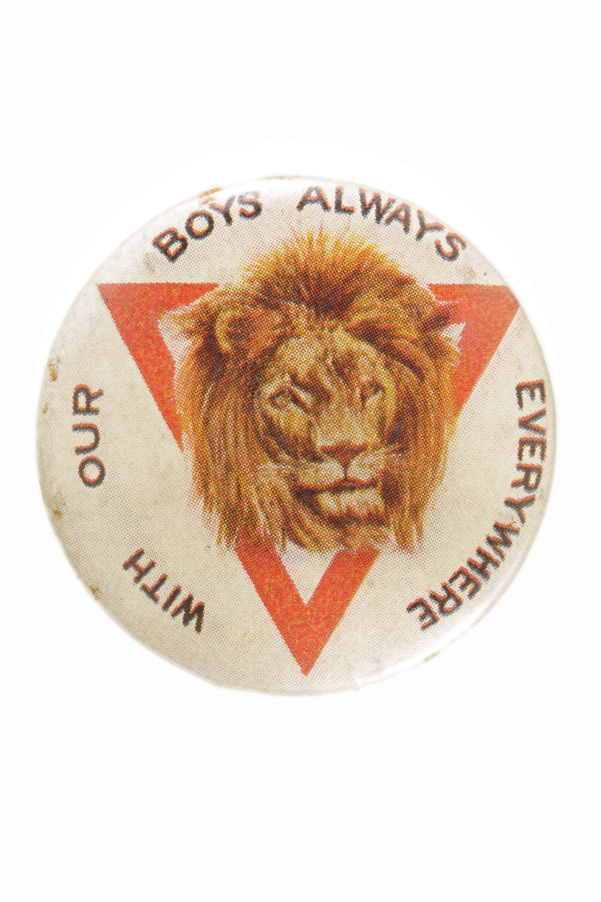 Small badge with pale brown background. Lion's head in a red triangle c. Brown printed text around the edge. Pin on the back. Red triangle is the symbol of the Young Men's Christian Association (YMCA) which provided 'comforts' for soldiers during the First and Second World Wars. The lion symbolises Britain.