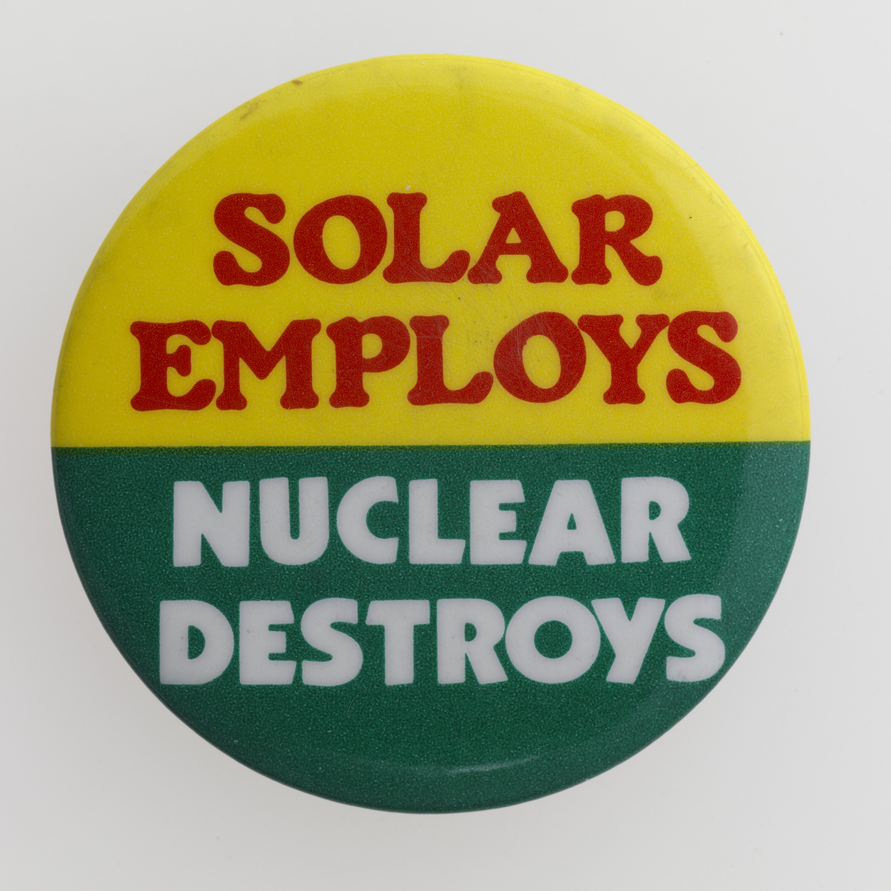 Round badge with the slogan 'Solar Employs, Nuclear Destroys' made by Donnelly Colt Buttons, circa 1960s-1980s. This is one of a series of badges and peace movement posters acquired by the museum following the exhibition 'Peace: an Exhibition' which explored the Peace movement and was part of the Victorian Government contribution to International Year of Peace in 1986. The badges explore the peace movement, nuclear disarmament and Hiroshima.