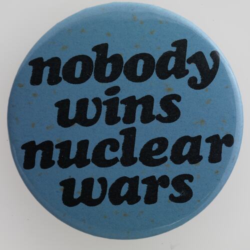 This badge bearing the slogan 'Nobody Wins Nuclear Wars' was used in anti-nuclear protests circa 1960s-1980s. The message is connected to the idea of Mutually Assured Destruction, a military theory claiming that that full-scale use of nuclear power in an attack would anihilate both sides involved. It it based on the idea that if a country owning nuclear weaponry is attacked, it would retaliate with the same means. The result of such hypothetical hostilities would be total destruction of both parties. The doctrine also holds that neither party would dare to attack first, therefore an equilibrium is suposedly maintained. This doctrine was applied during the Cold War.