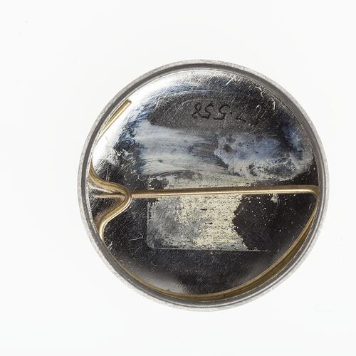 Medium size badge. Black background. Red radioactive symbol c. with a skull in the middle. Red printed text encircling the perimeter of the badge. Pin on the back.