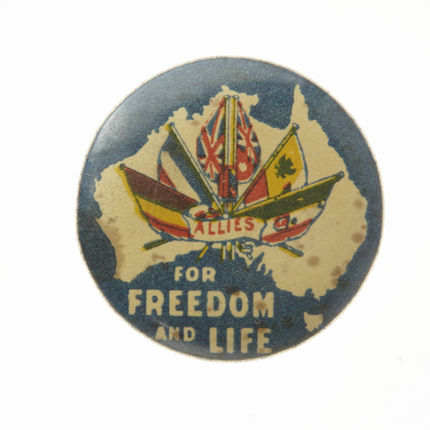 Small circular button. Dark blue background upon which is printed a white map of Australia. Within the map are six flags whose poles meet in the centre. There is a scroll beneath the flap on which is printed "allies" in red. Beneath Australia is the caption.