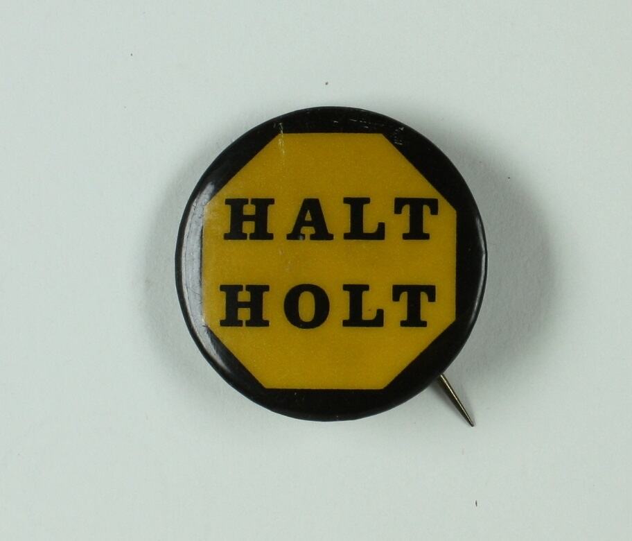 'Halt Holt' badge, alternatively known as a button, made in 1965 and acquired by the donor during his period of draft resistance and other anti-conscription activities between 1965 and 1972.