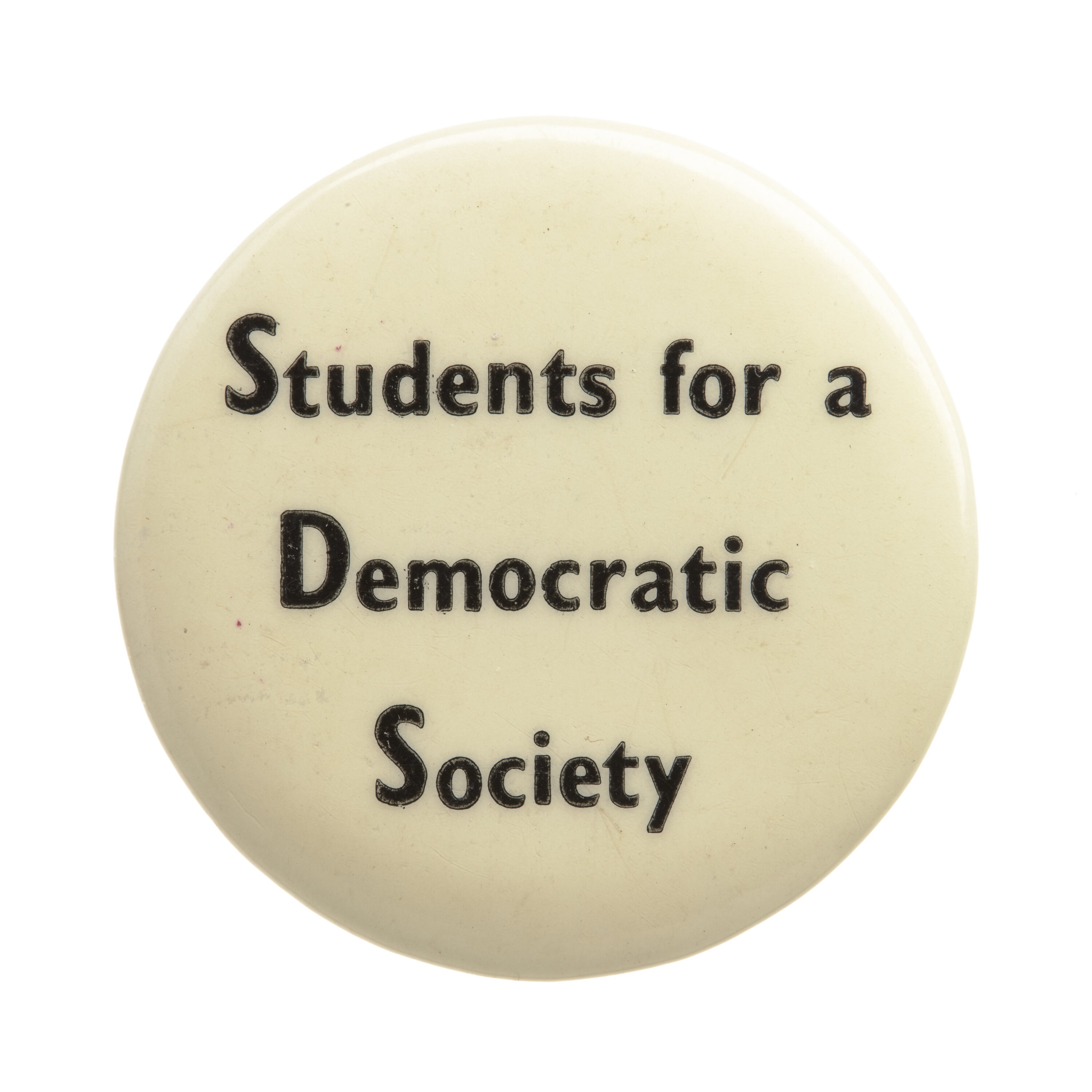 Printed, black ink, front, 'Students for a/Democratic/Society'.