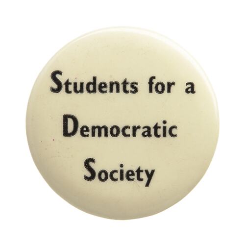 Circular badge with the slogan 'Students for A Democratic Society', made in 1968. It was produced by the group Students for a Democratic Society at Monash University. It was acquired by Michael Hamel-Green during his period of draft resistance and other anti-conscription activities between 1965 and 1972. Michael was one of the initiators and core members of the Students for a Democratic Society, founded at The University of Melbourne in 1968. Student activism at Monash University during the late sixties and early seventies saw militant occupations of university buildings, student general meetings with numbers in their thousands, and protests around a range of issues both on and off-campus.