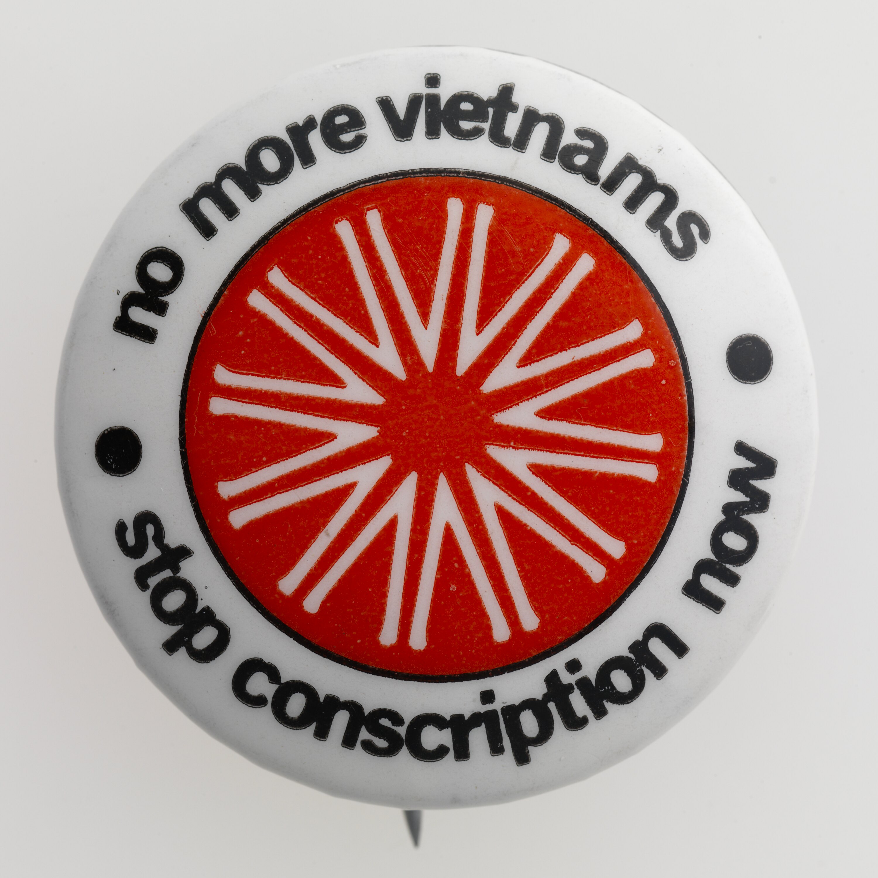 Badge with the slogan 'No More Vietnams', made in 1970. It was worn by Olive Zakharov during anti-Vietnam war and anti-conscription rallies, held in Melbourne during 1970-1971. It is one of a series of badges she collected while participating in the moratorium marches during 1970 and 1971.