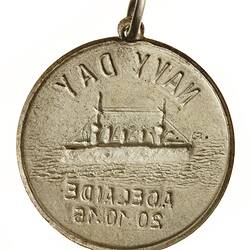 Round metal medal in silver colour. Design pressed into metal. Raised outer rim and metal ring at top for ribbon. Picture of naval ship in centre. Words "NAVY DAY / ADELAIDE / 20 10 16".